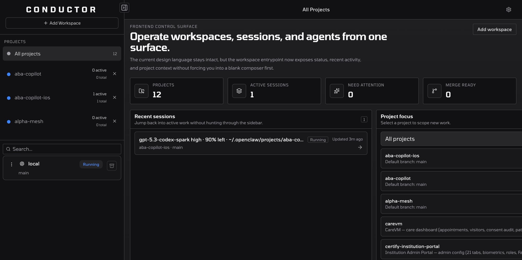 Monitor every project, see active sessions at a glance, and jump straight into the repo or runtime that needs attention without losing the local-first workflow.