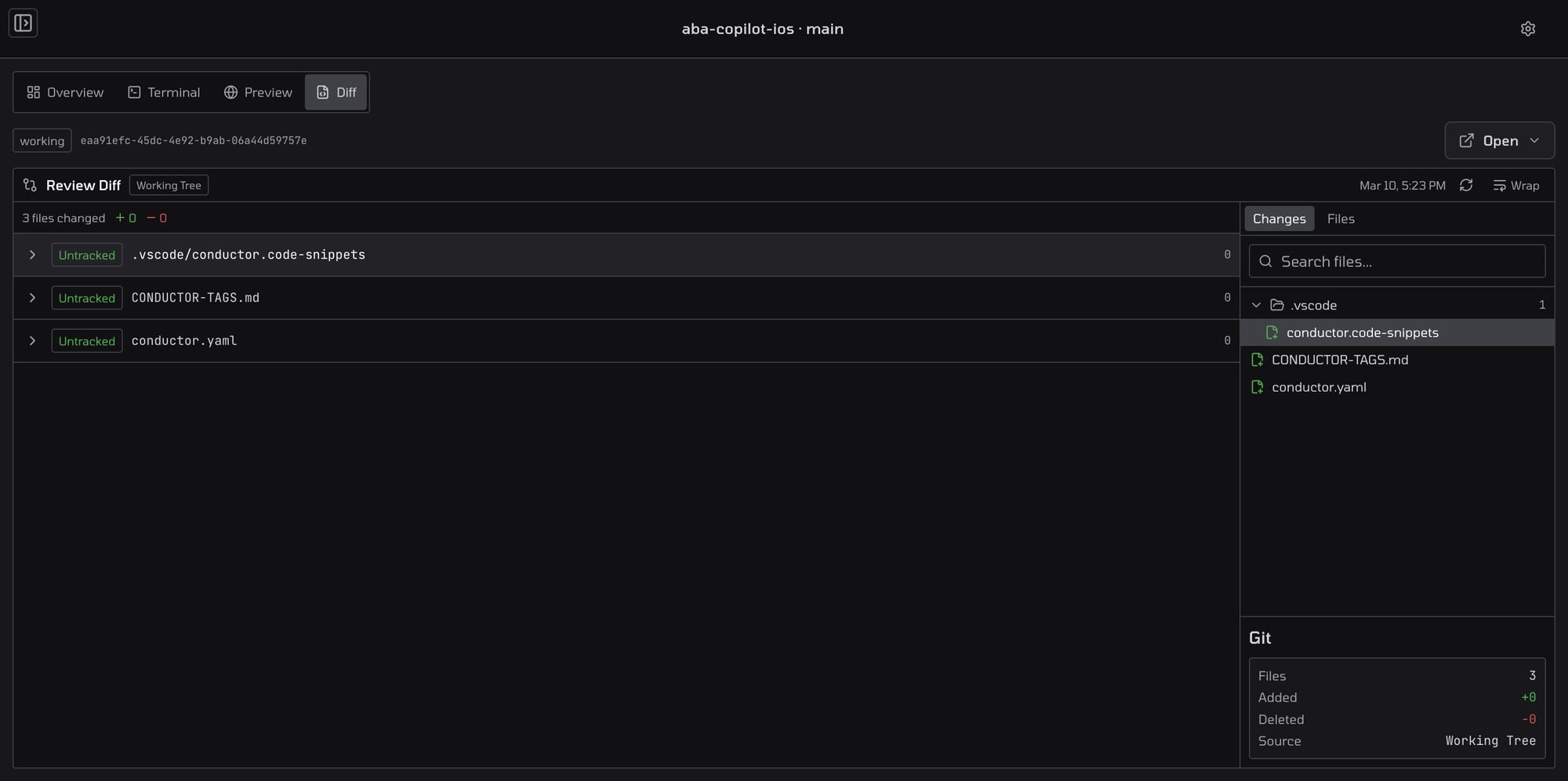 Inspect changed files, review summaries, and session output from the same surface so PR approval feels like part of the agent workflow, not a separate tool hop.